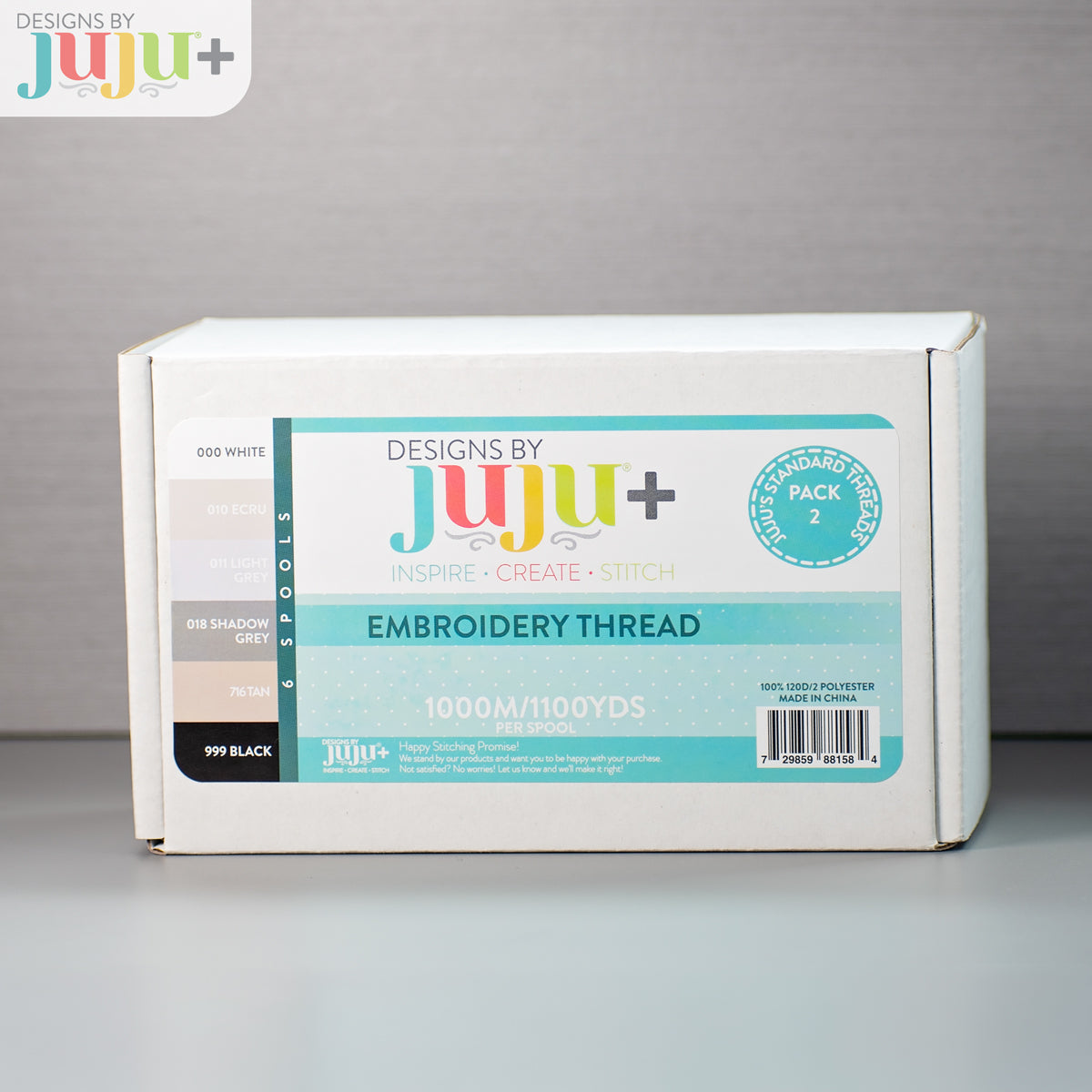 Every stitcher needs a solid set of go-to neutrals—and this pack is exactly that. JuJu's Favorite Thread 6-Pack (Basics) includes six everyday shades that work with just about everything, from crisp whites to deep black and the perfect in-between greys and tans. Each spool is 100% polyester, 40wt, with a generous 1000M / 1100 yds—so you’re always ready to stitch, outline, and finish like a pro.